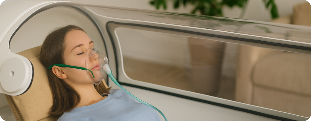 Pri HBOT terapiji vdihavaš 100-% kisik v posebni komori, kjer je zračni tlak višji kot običajno. To omogoča, da se kisik raztopi v plazmi in doseže tudi tista tkiva, ki ga v normalnih razmerah ne bi dobila dovolj. Rezultat so številne koristi za zdravje in počutje.